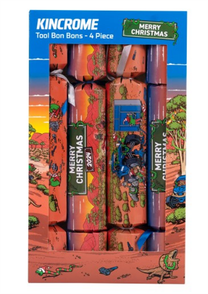 Each Bon Bon contains a Kincrome gift, joke and crown! 2m Metric Tape Measure Adjustable Wrench 150mm (6”) SMD LED Penlight 10mm 1/4" Emergency Socket with Coupler Celebrate Christmas in...