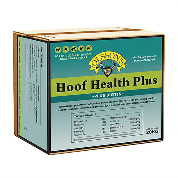 Olsson’s Hoof Health Plus is a supplement for all livestock, containing bentonite & biotin. It assists in correcting hoof disorders associated with wet ground, such as cracking, ulceration and abscesses.