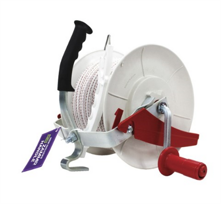 Geared Reel pre-wound with poliwire. Comes with ZAMMR Handle.Features:3:1 gear ratio with a solid steel crankFrame insulated from spoolUse with carry handle or on mounting postUV stabilised for long lifeGalvanised steel...