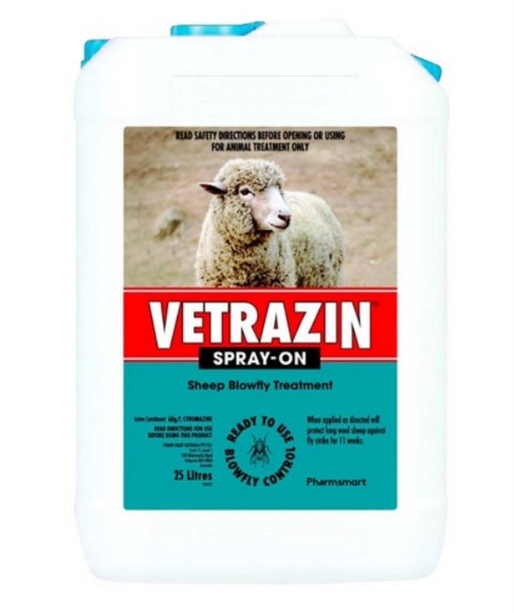 Developed for Australian conditions, Vetrazin? Spray-On will give your sheep up to 11 weeks protection against Blowfly (Lucilia cuprina) strike, including organophosphate resistant strains.